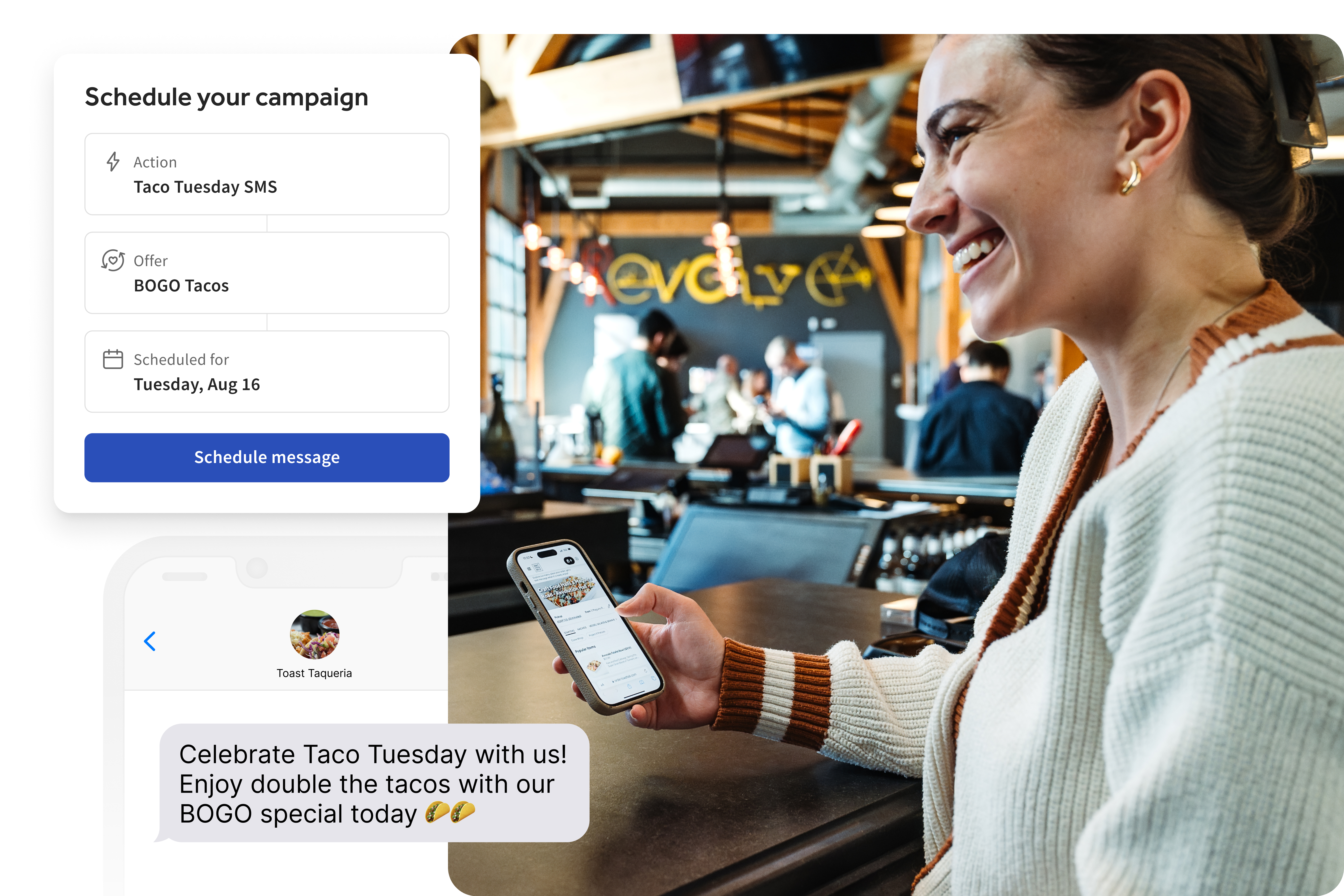 “I love being able to communicate the same day with people — If it’s a slow day, I’ll send a promo like ‘$5 off your bill’ or ‘free appetizer if you show this message.’ I know it is working because I see people come in and redeem these offers the same day," said Jason Wolbransky, a General Manager of Dog & Bull Taphouse and Kitchen, a single-location bar and restaurant in Croydon, PA. "The automated campaigns are great, too—I turn them on and they run in the background. On average we’ve been able to generate $34 in sales per automated text sent, which can add up quickly as I grow my subscriber list3."